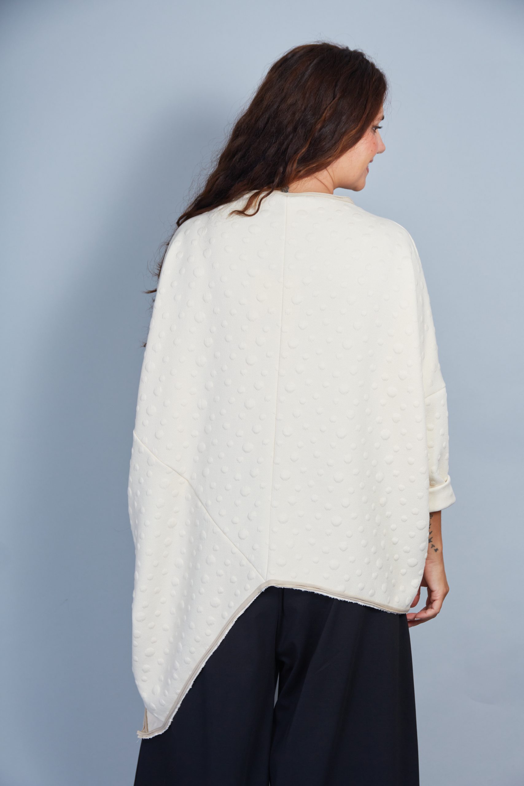 Jersey asimétrico. Cuello redondo. Hombros caídos y mangas largas. Punta lateral. Mano suave. Ajuste cálido y cómodo.