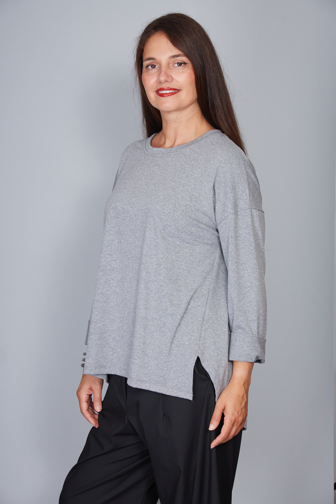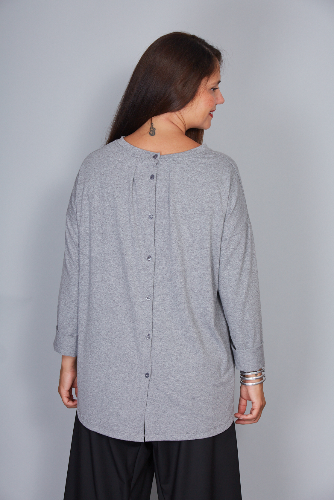 Camiseta de punto de algodón con botones en la espalda. Escote redondo. Hombros caídos y mangas largas. Línea acampanada. Espalda más larga. Corte holgado y cómodo.