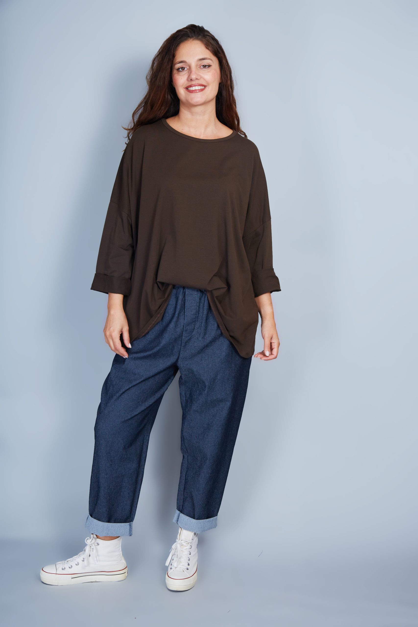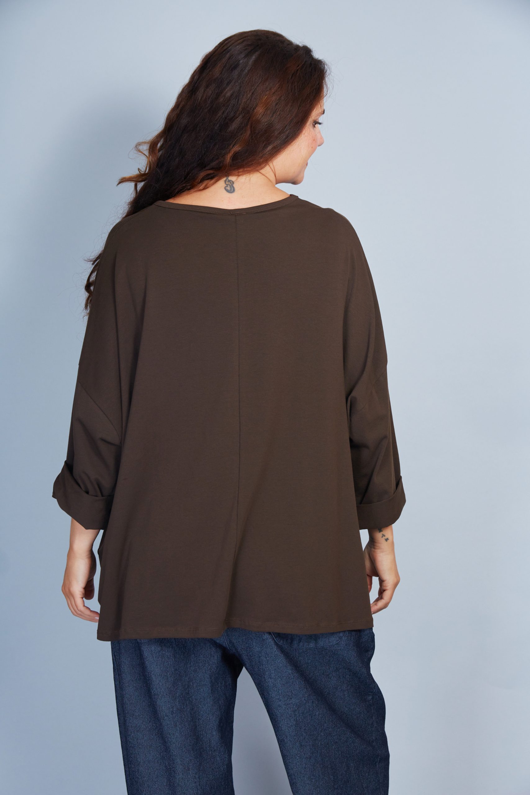Camiseta de algodón. Escote redondo. Hombros caídos y mangas largas. Ajuste holgado y muy cómodo.