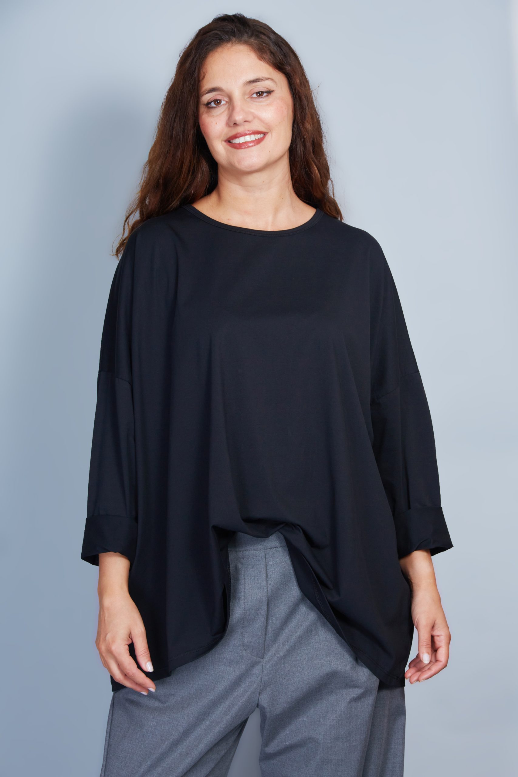 Camiseta de algodón. Escote redondo. Hombros caídos y mangas largas. Ajuste holgado y muy cómodo.