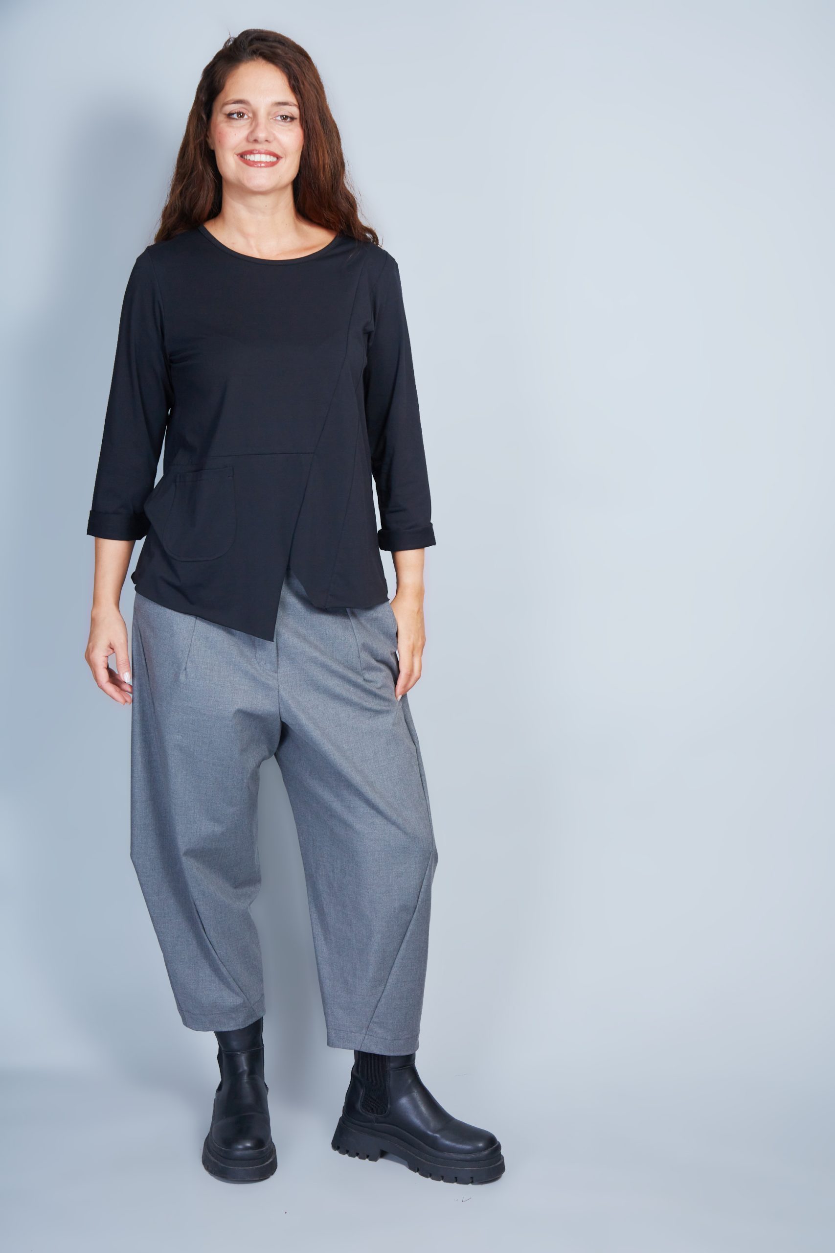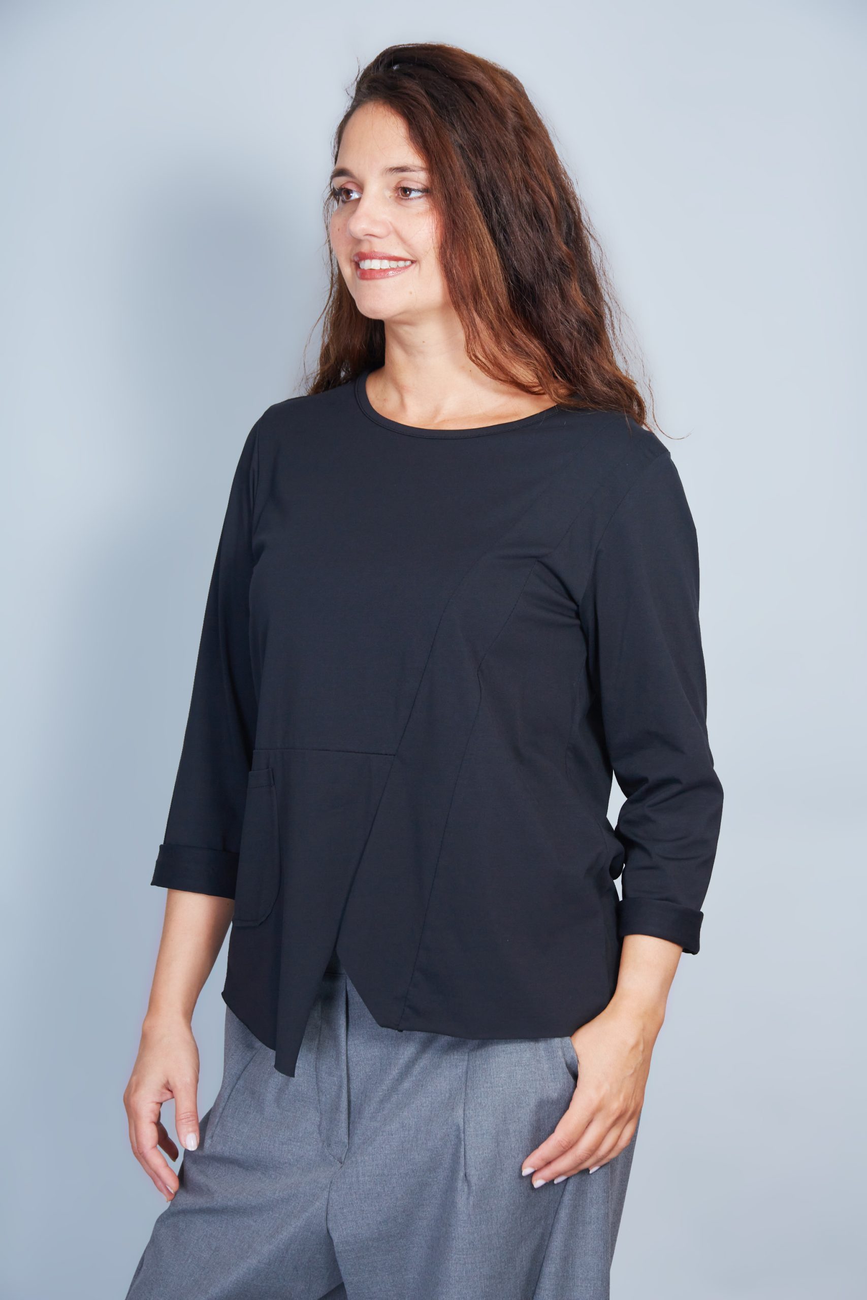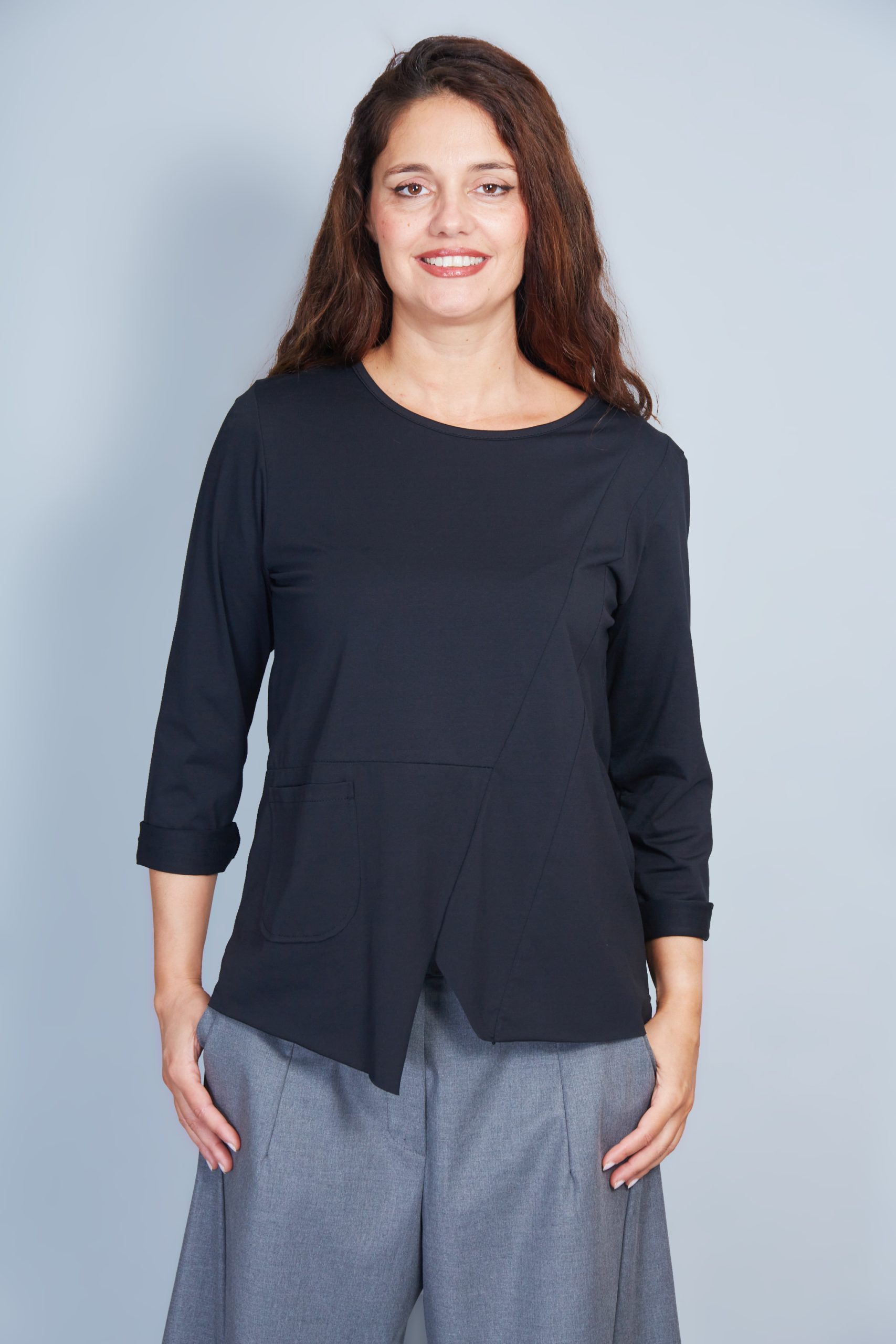 Camiseta de algodón, escote redondo, manga larga. Hendidura frontal. Bolsillo frontal. Ajuste regular.