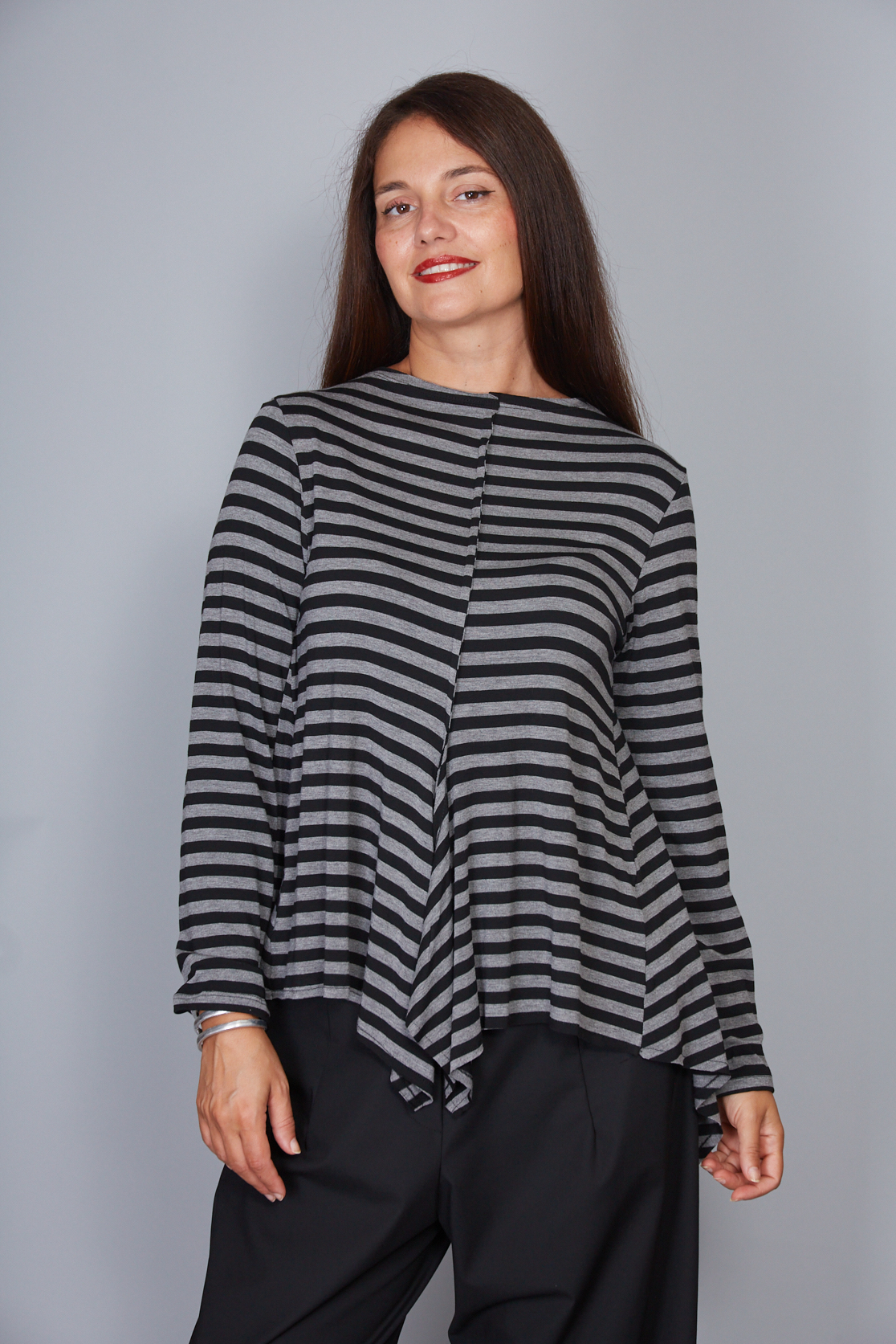 Camiseta de reyas en viscosa. Escote barco pequeño. Hombros regulares y mangas largas. Corte asimétrico. Ajuste cómodo.