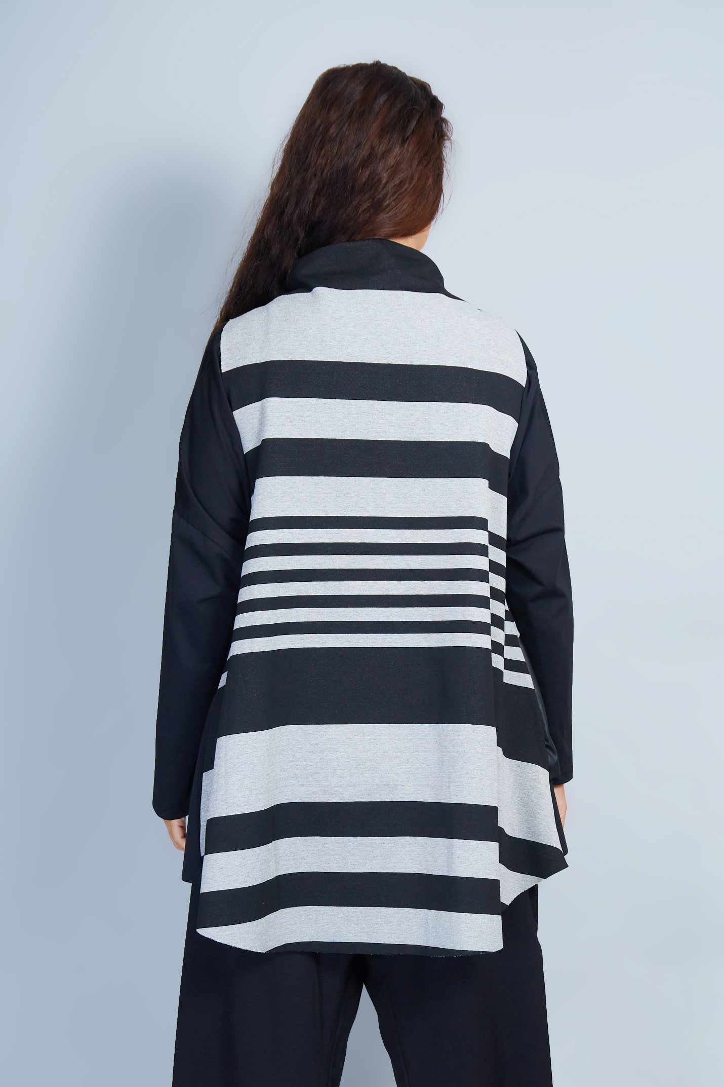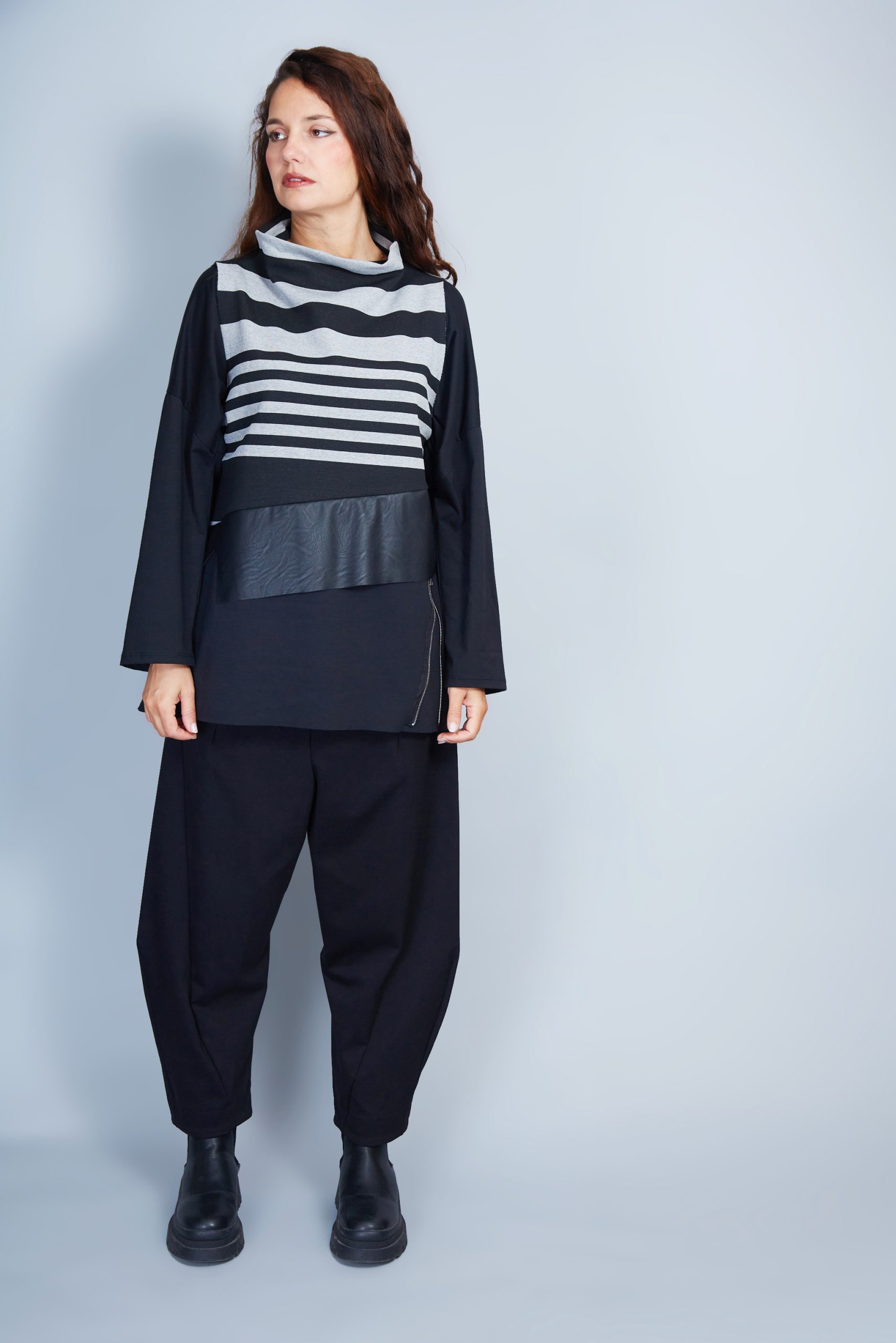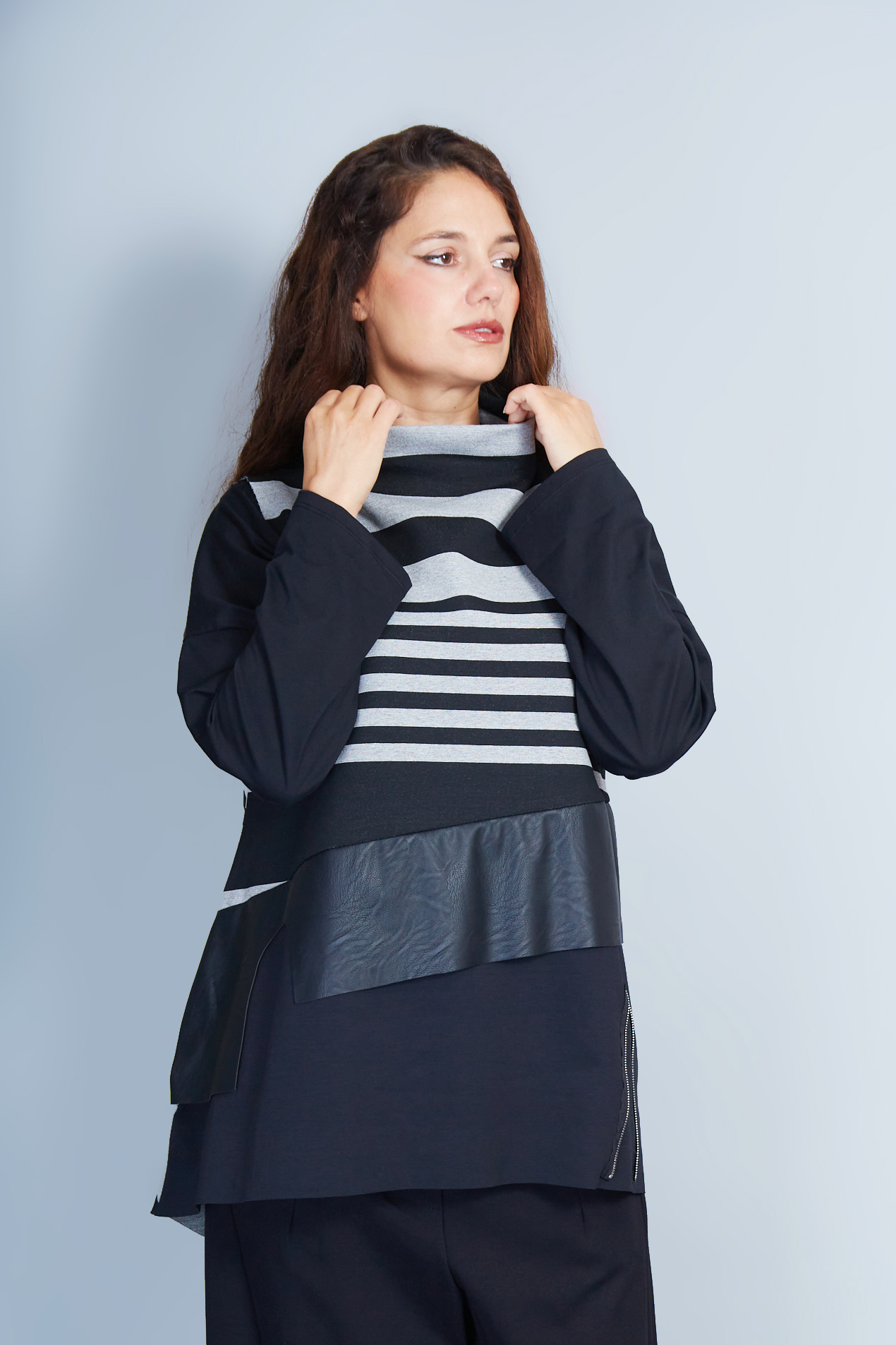 Chaleco en punto Milano ligero, cuello subido suave y sin mangas. Bajo redondeado sin rematar más largo en la espalda. Corte ancho y acampanado. Detalles de poli piel.