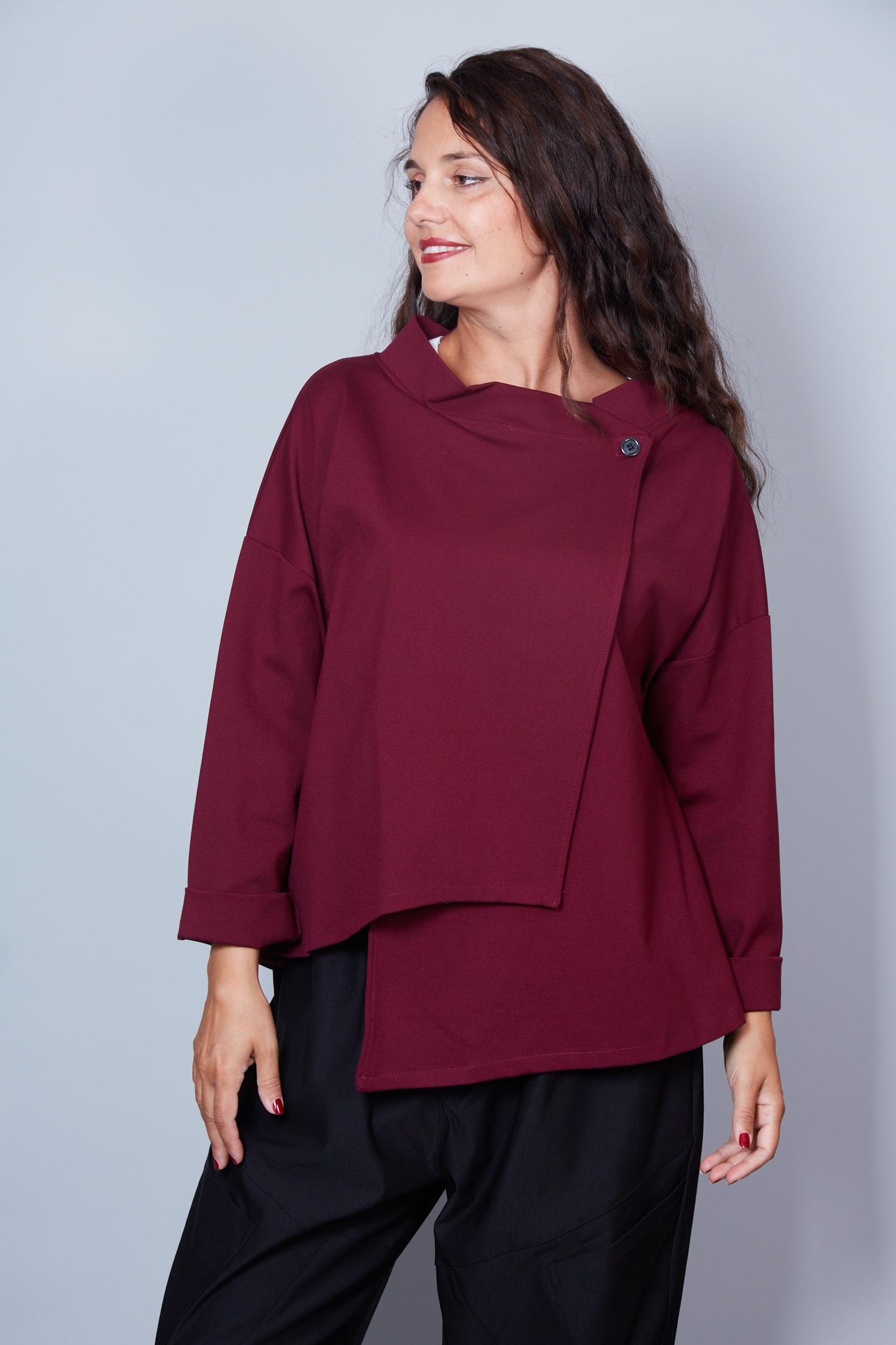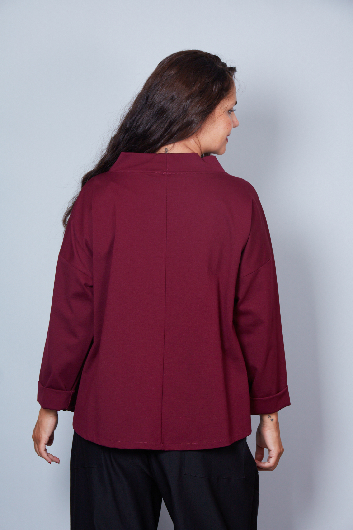Chaqueta de manga larga. Cierre con botones en el cuello. Hombro caído. Punta frontal más larga. Ajuste cómodo.