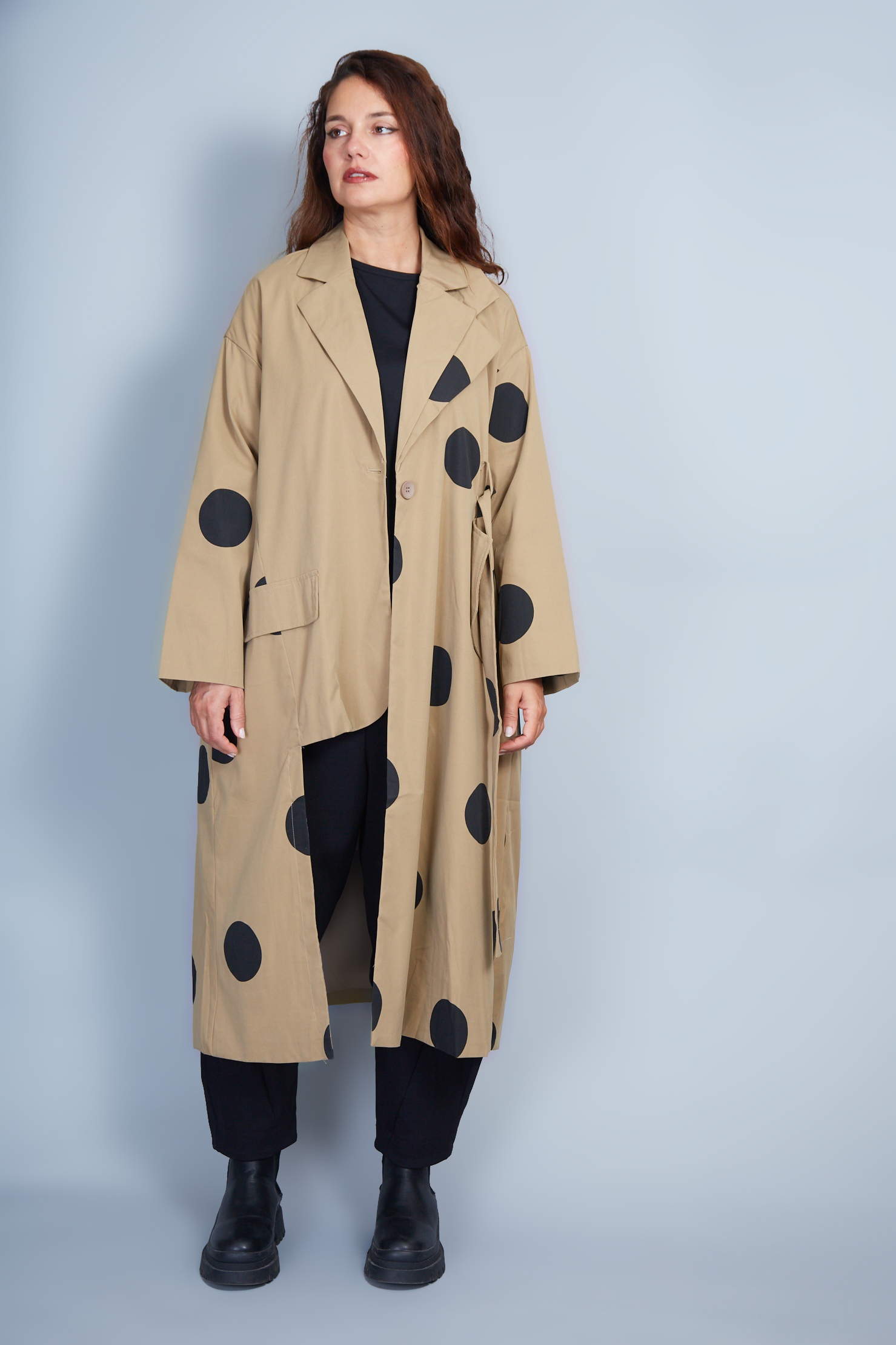 Gabardina larga de lunares. Largo asimétrico. Cierre con un botón. Bolsillos laterales. Ajuste muy cómodo.