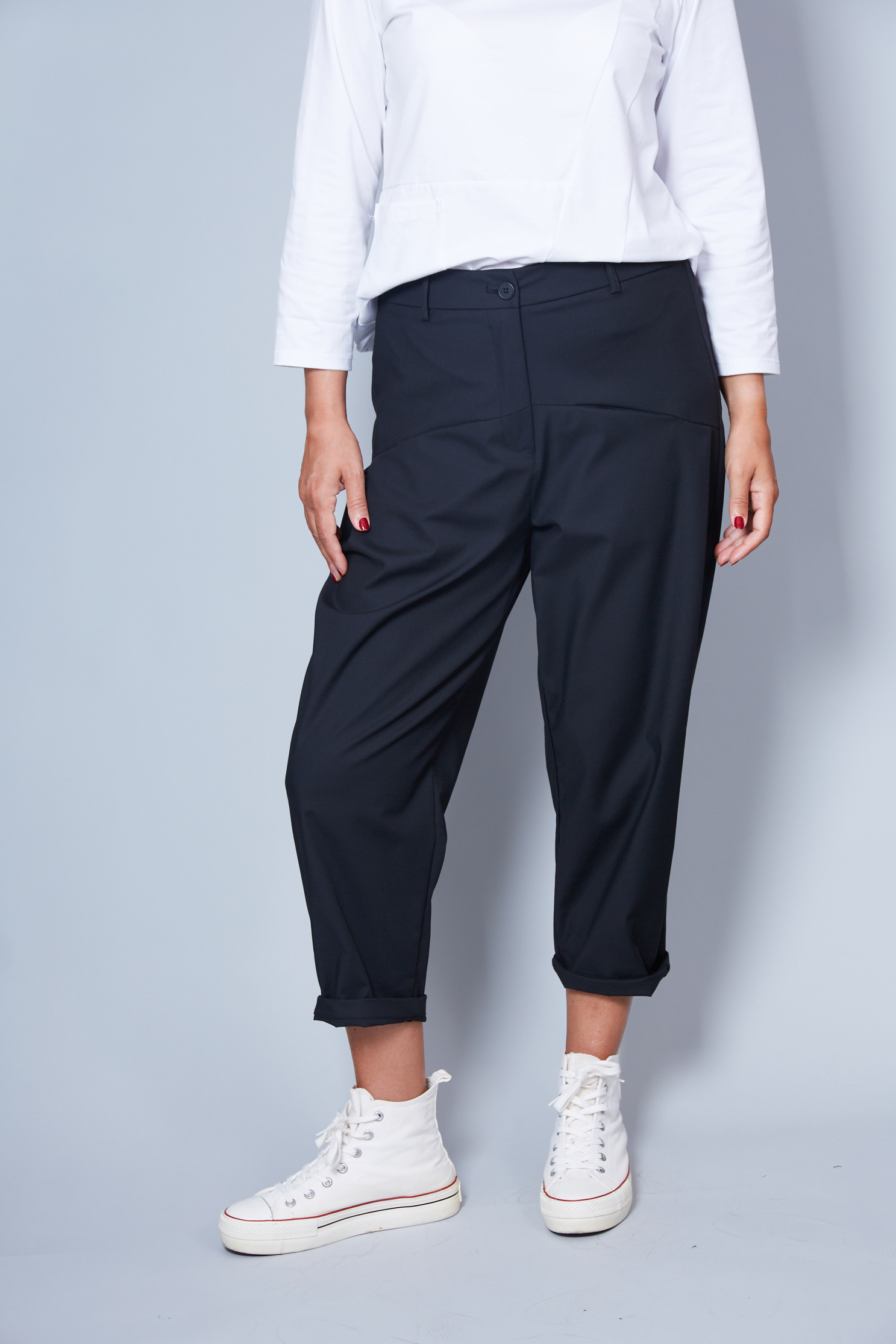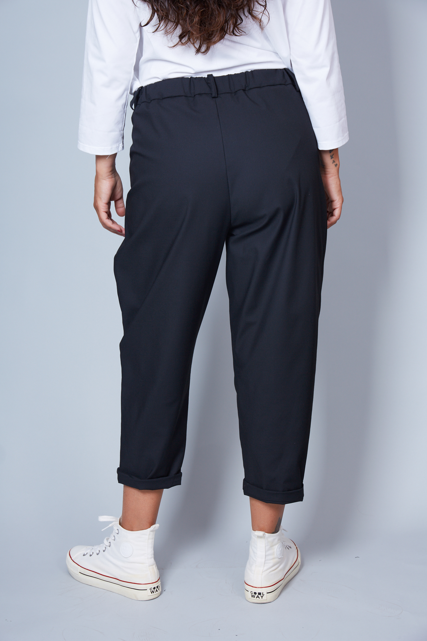 Pantalón de viscosa con cintura elástica y botón, bolsillos laterales y pinzas frontales. Ajuste regular.