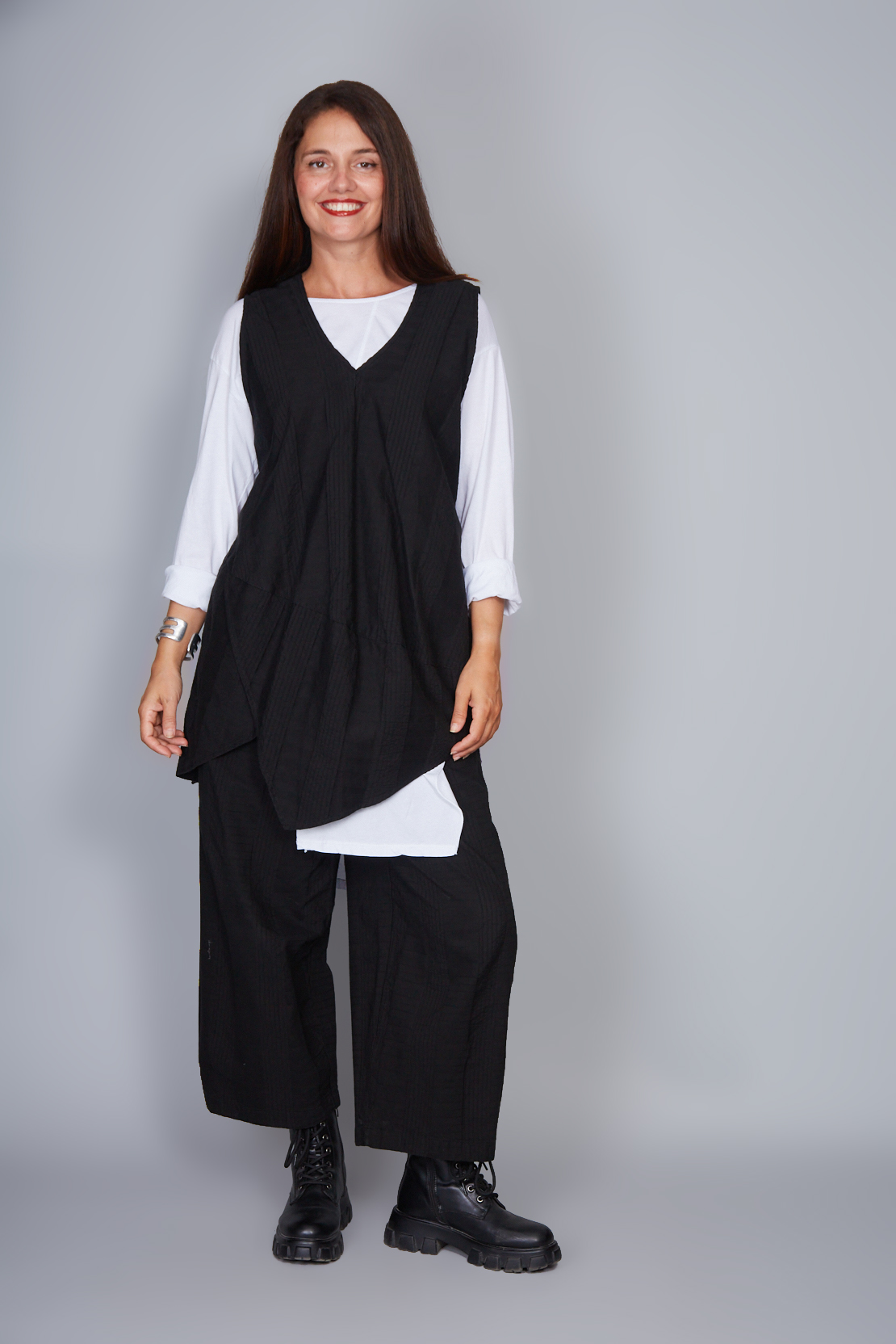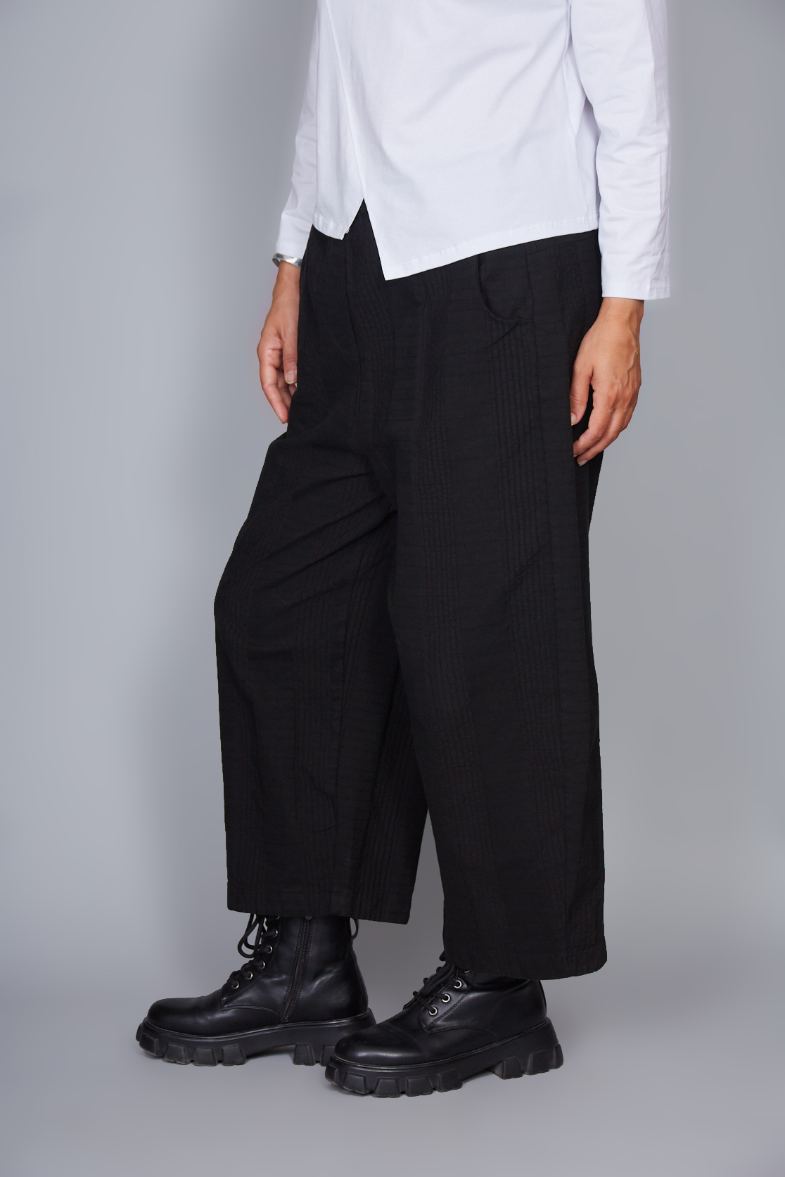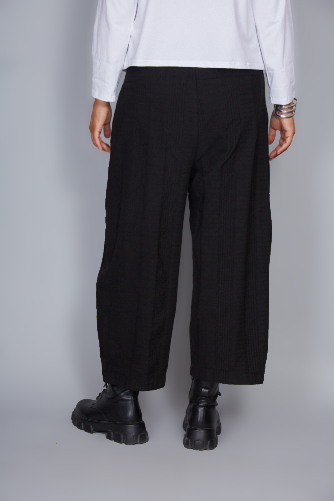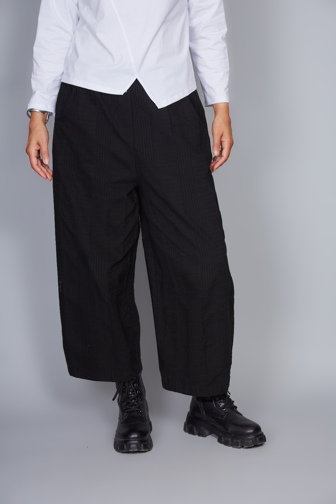 Pantalón amplio de algodón. Banda elástica en la cintura. Bolsillos laterales ocultos. Ajuste amplio y cómodo.