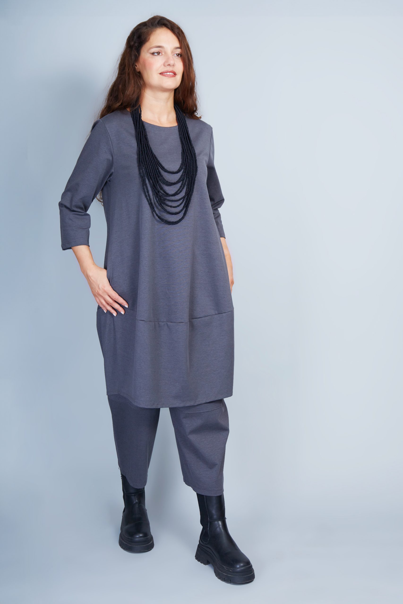 Vestido midi en punto milano. Escote redondo. Bolsillos laterales ocultos. Corte ovalado. Hombros regulares y mangas 3/4. Ajuste cómodo.